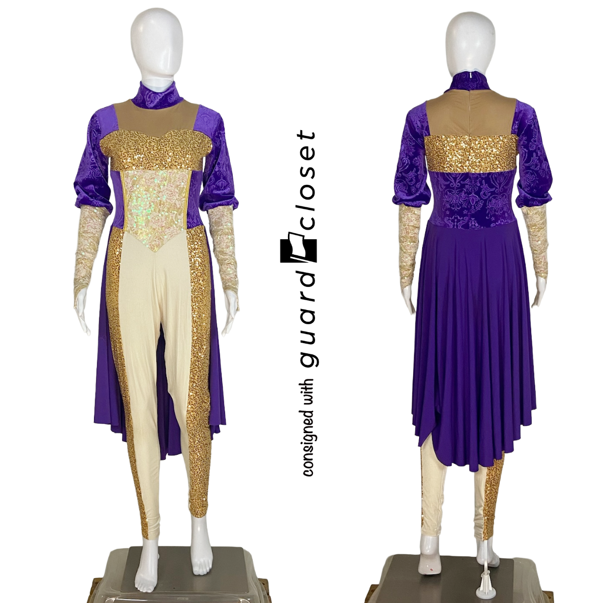 Item description: 19 Purple Gold Skirted Long Sleeve Unitards with skin tone panels