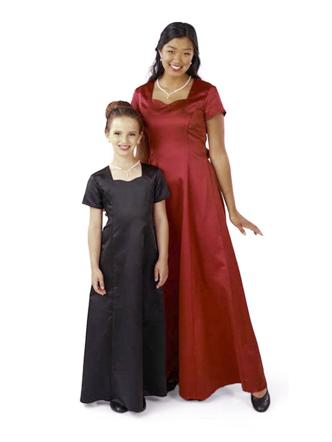 Sweetheart neck, short sleeve, floor length gown with princess seams. Features back ties and back zipper. Made in high performance satin fabric.